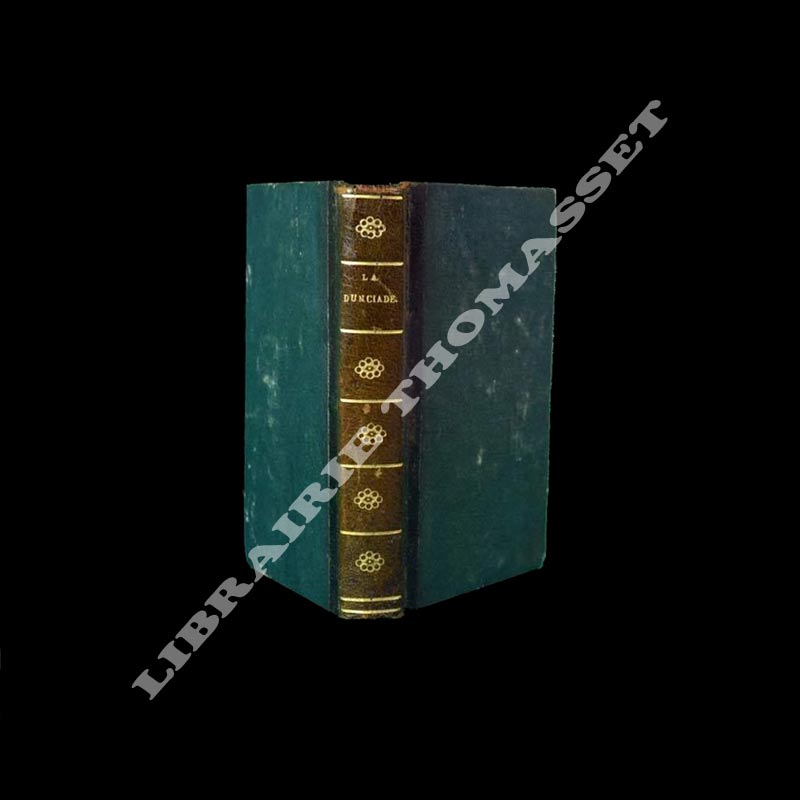 Londres 1781, in 18 (14x9cm) 1/2 basane, 299 pages, 1ère partie la Dunciade poème en dix chants, 2ème partie la Dunciade de pope au Dr Jonathan Swift, petit défaut à la coiffe sup.