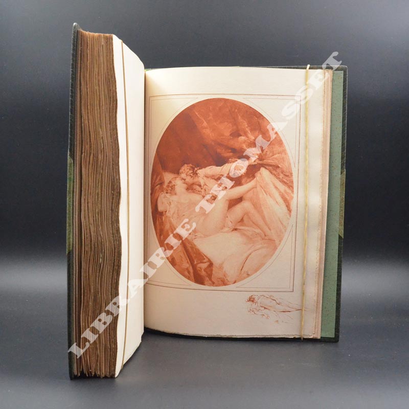 Paris, Veuve Romagnol 1923, belle reliure 1/2 chagrin à coins 21x27cm, 158 pages de texte avec illustrations, en-tête en noir, lettrines et vignettes imprimées en noir réhaussées d'or, état des gravures en fin de volume comportant 38 sanguines avec remarques, couverture conservée, un des 25 exemplaires de tête comprenant une aquarelle originale de René Lelong. Petite et légère auréole (env 1x1cm) en bord de feuille gauche (sans atteinte) de l'aquarelle et en bord de feuille droit de la page de titre. Dos légèrement passé.